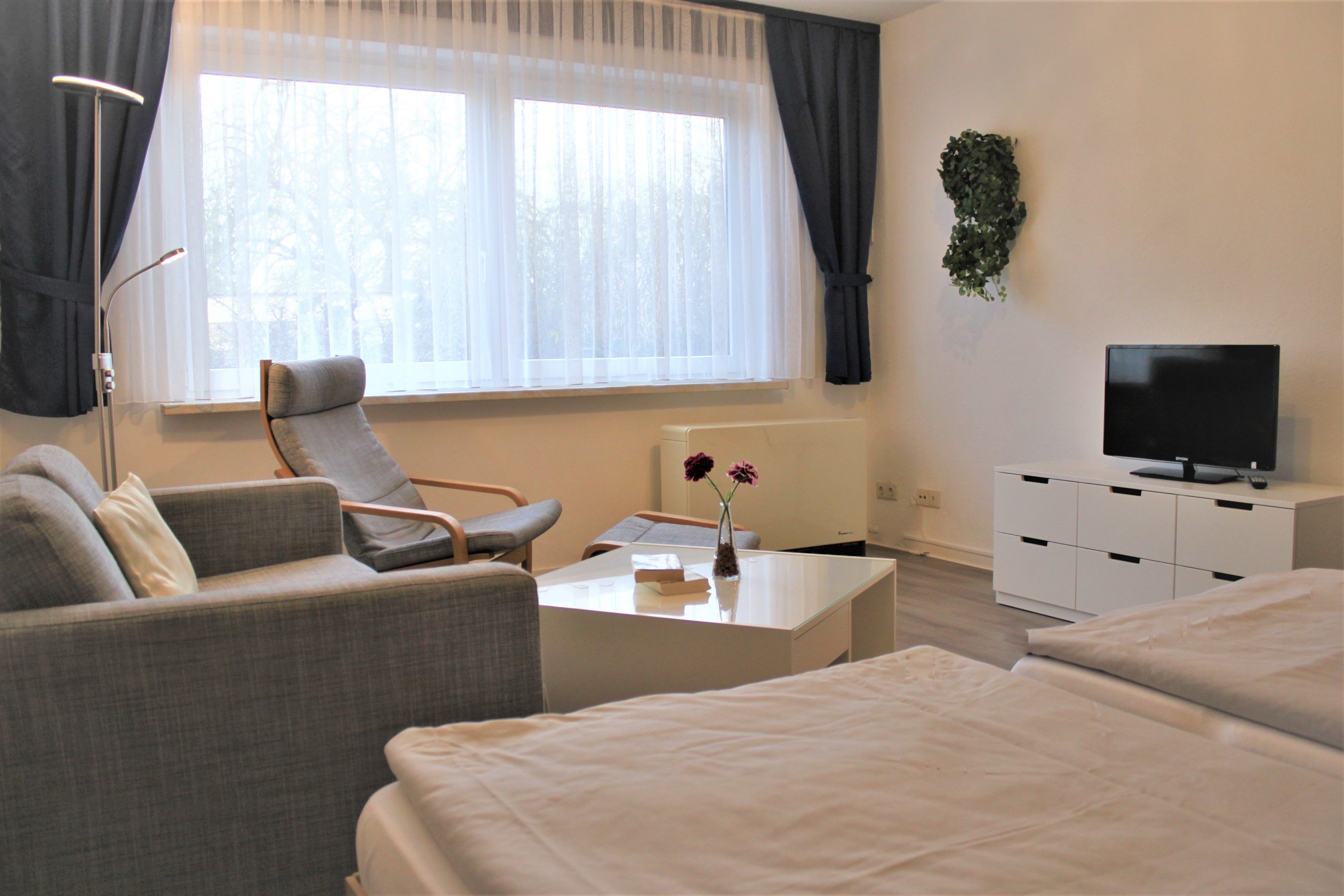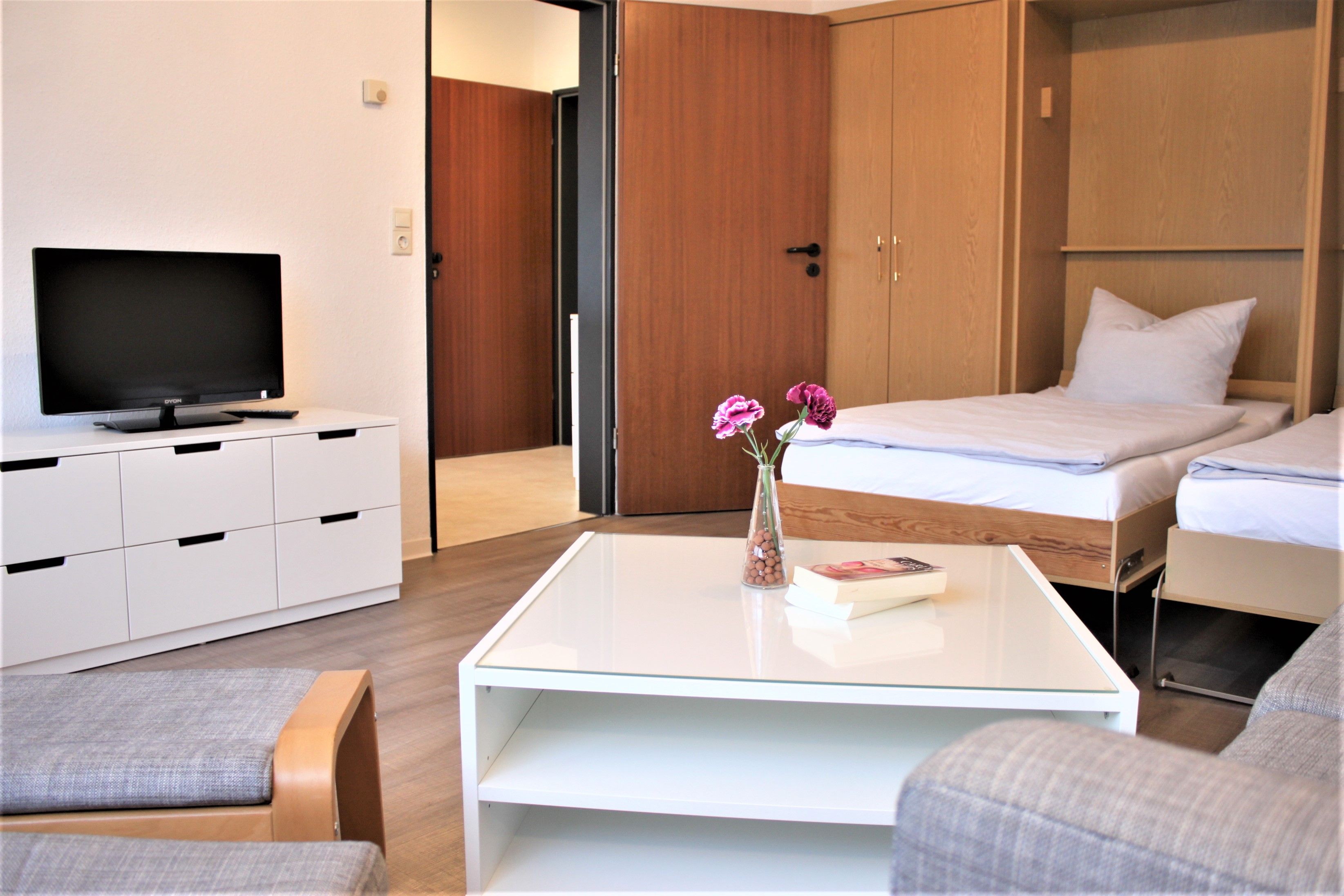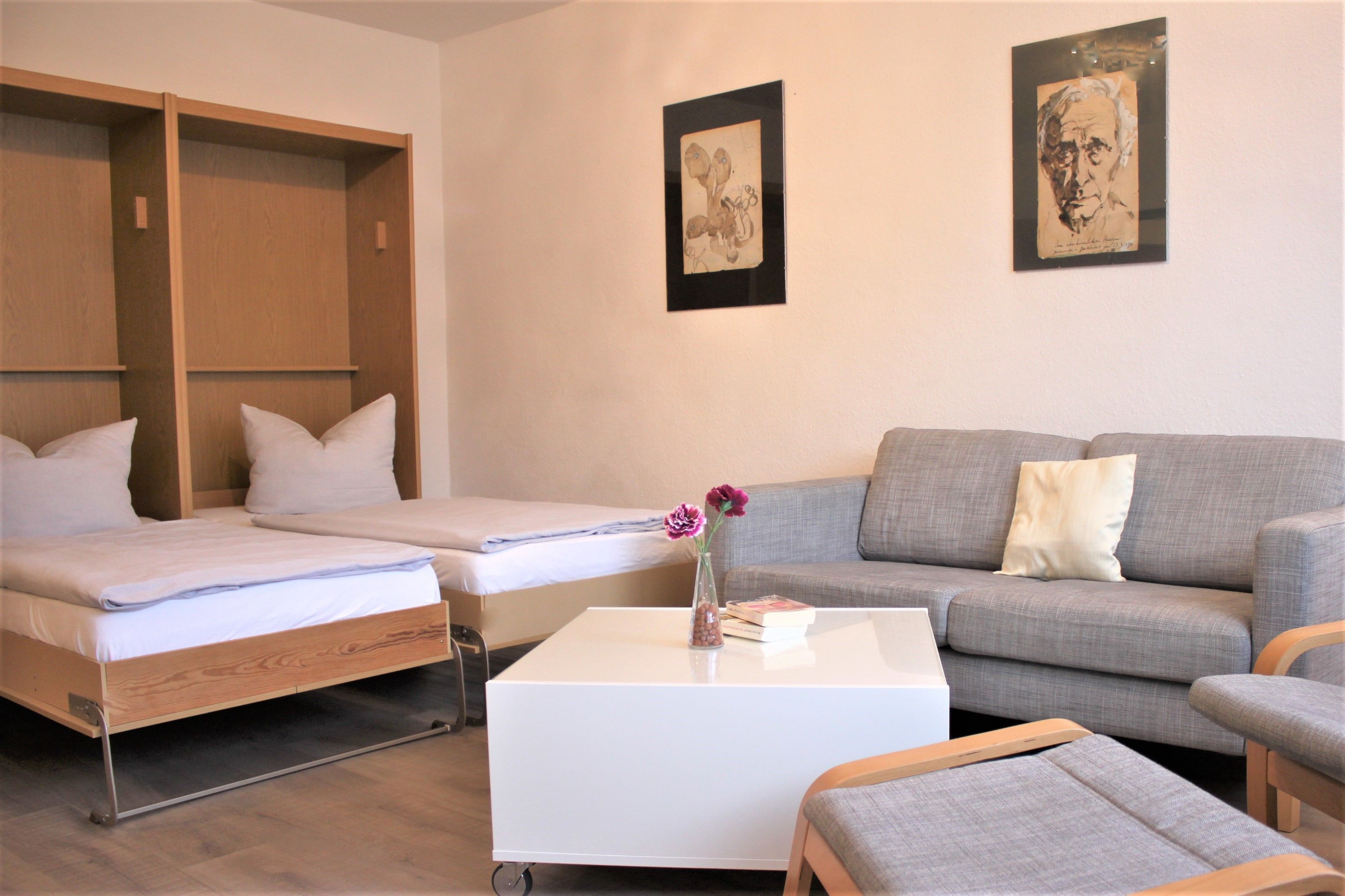 Separates Wohnzimmer mit gemütlicher Sofaecke, TV-Gerät, WLAN und zwei Einzelbetten (Schrankbetten)