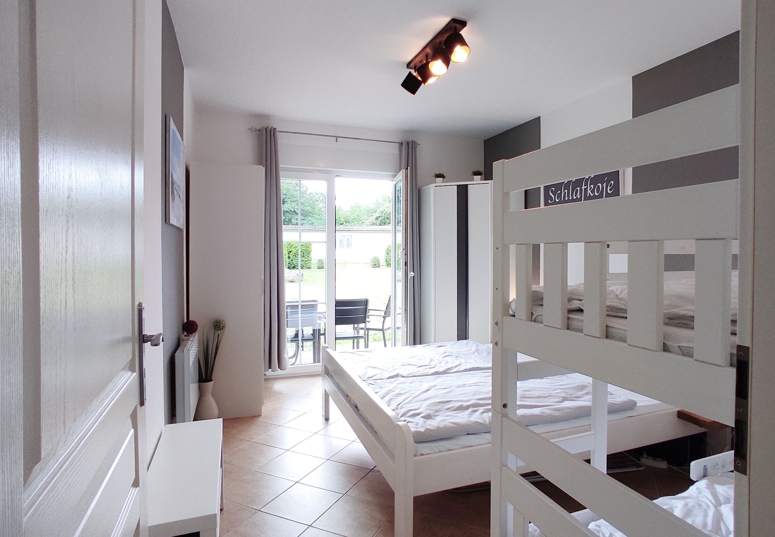 1 Schlafzimmer mit Doppelbett und Etagenbett.