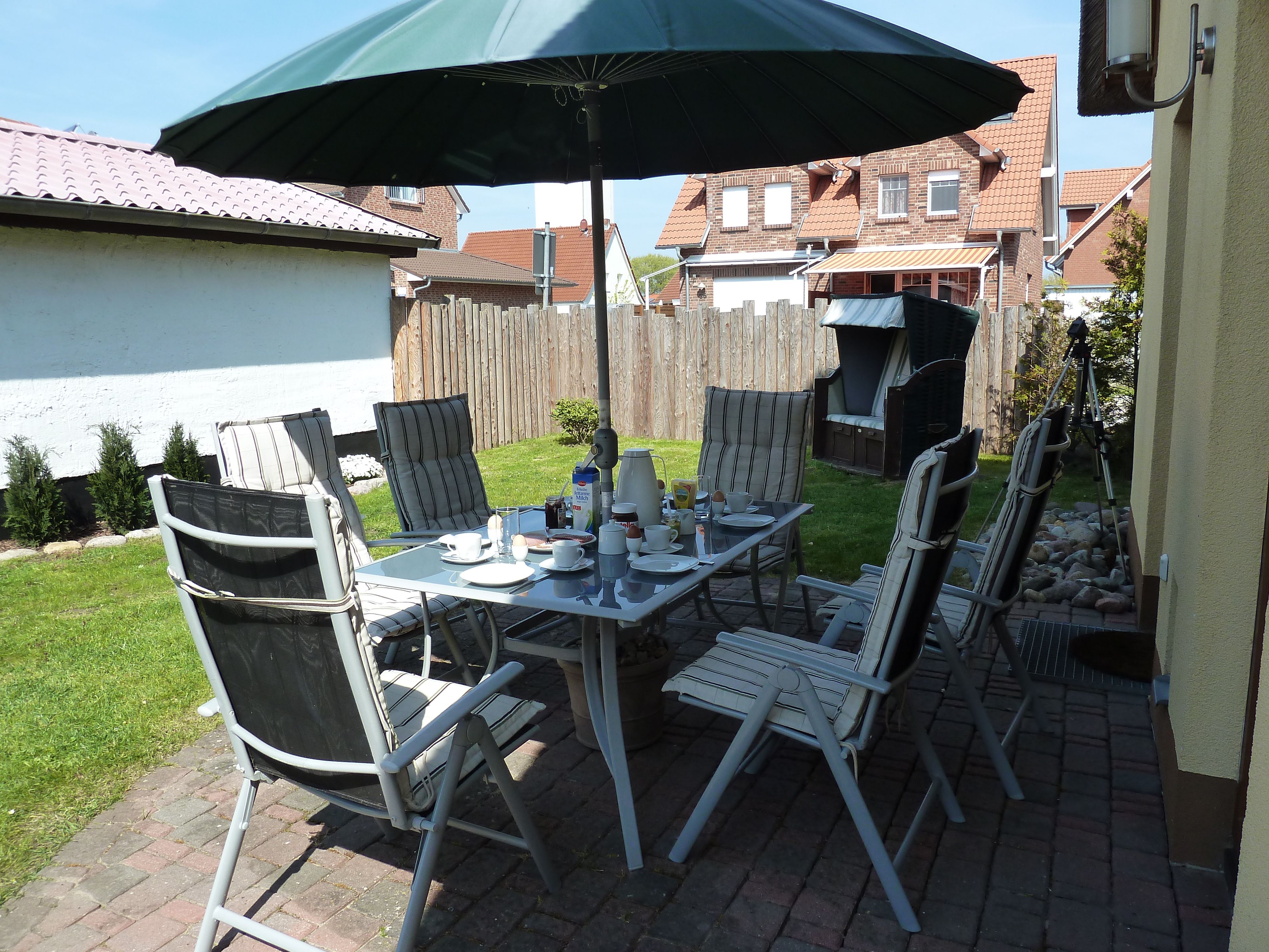 • Großzügige Terrasse mit Gartenmöbeln, Strandkorb und Blick in den Garten