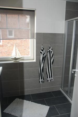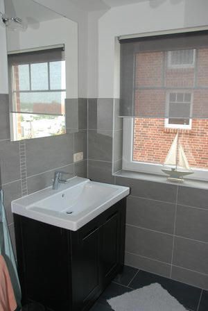 Badezimmer mit Fenster, Dusche, Waschtisch und WC