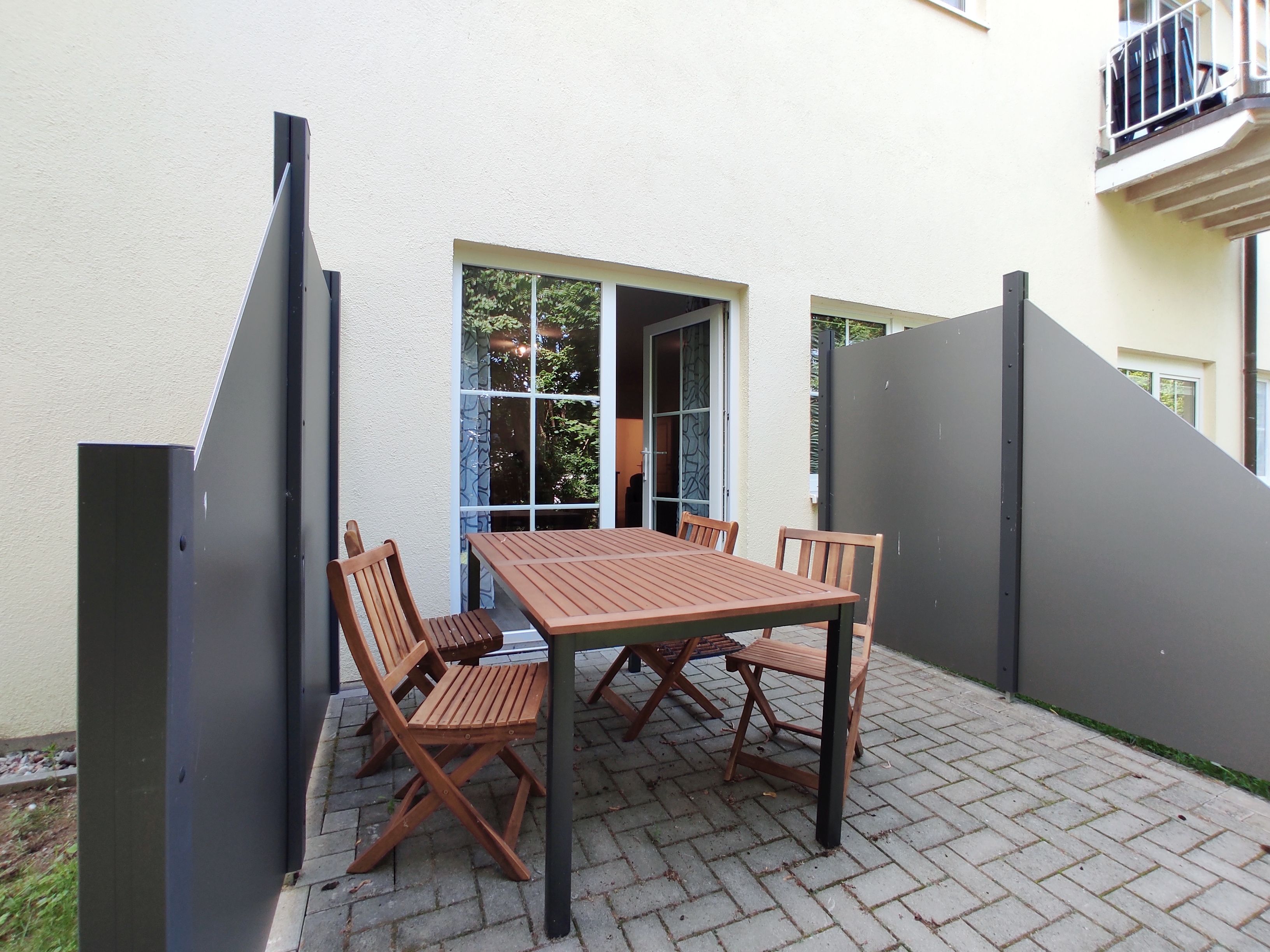 Terasse mit Gartenmöbeln und Windschutz.