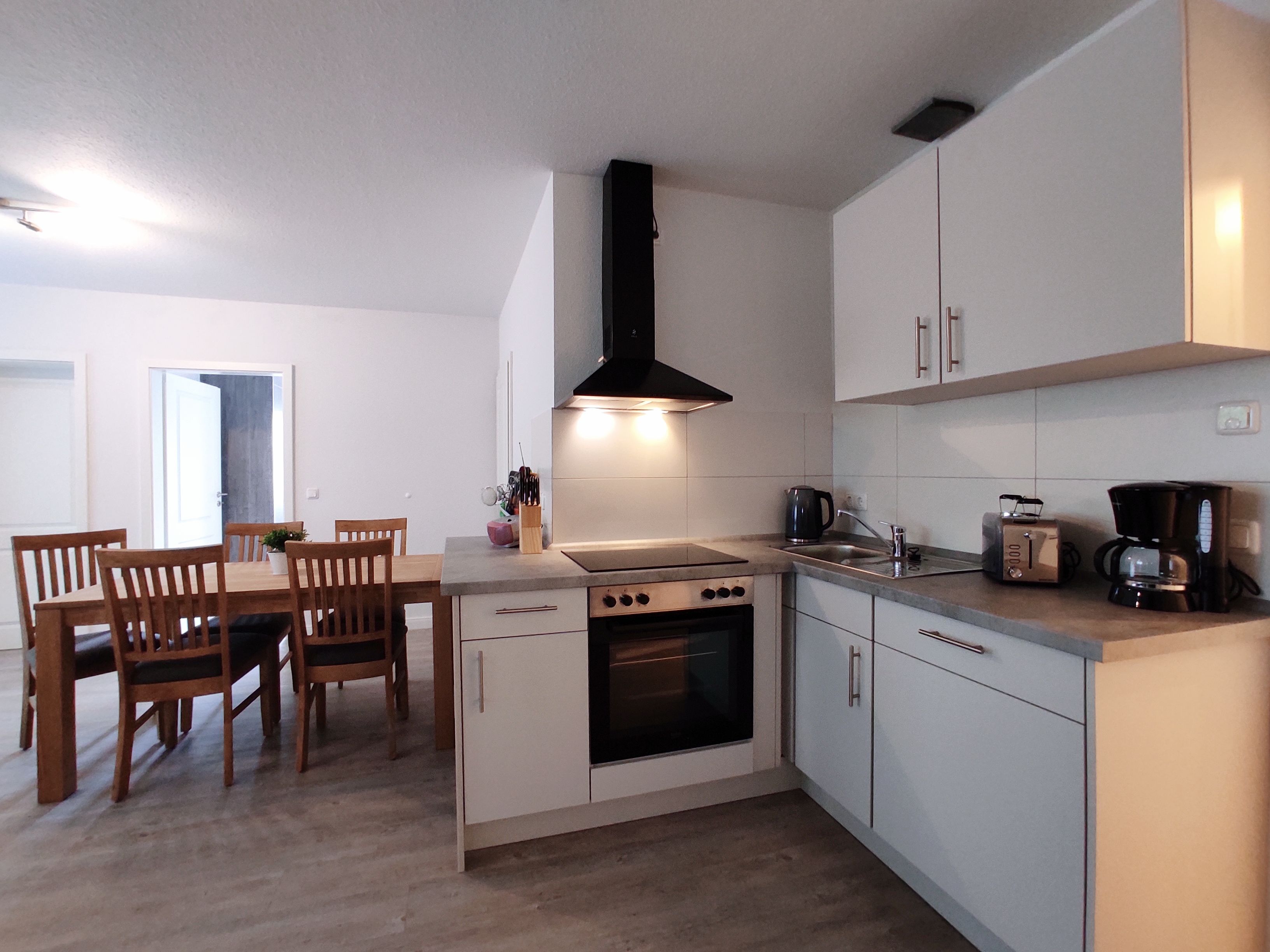 Gut ausgestattete, offene Küche.