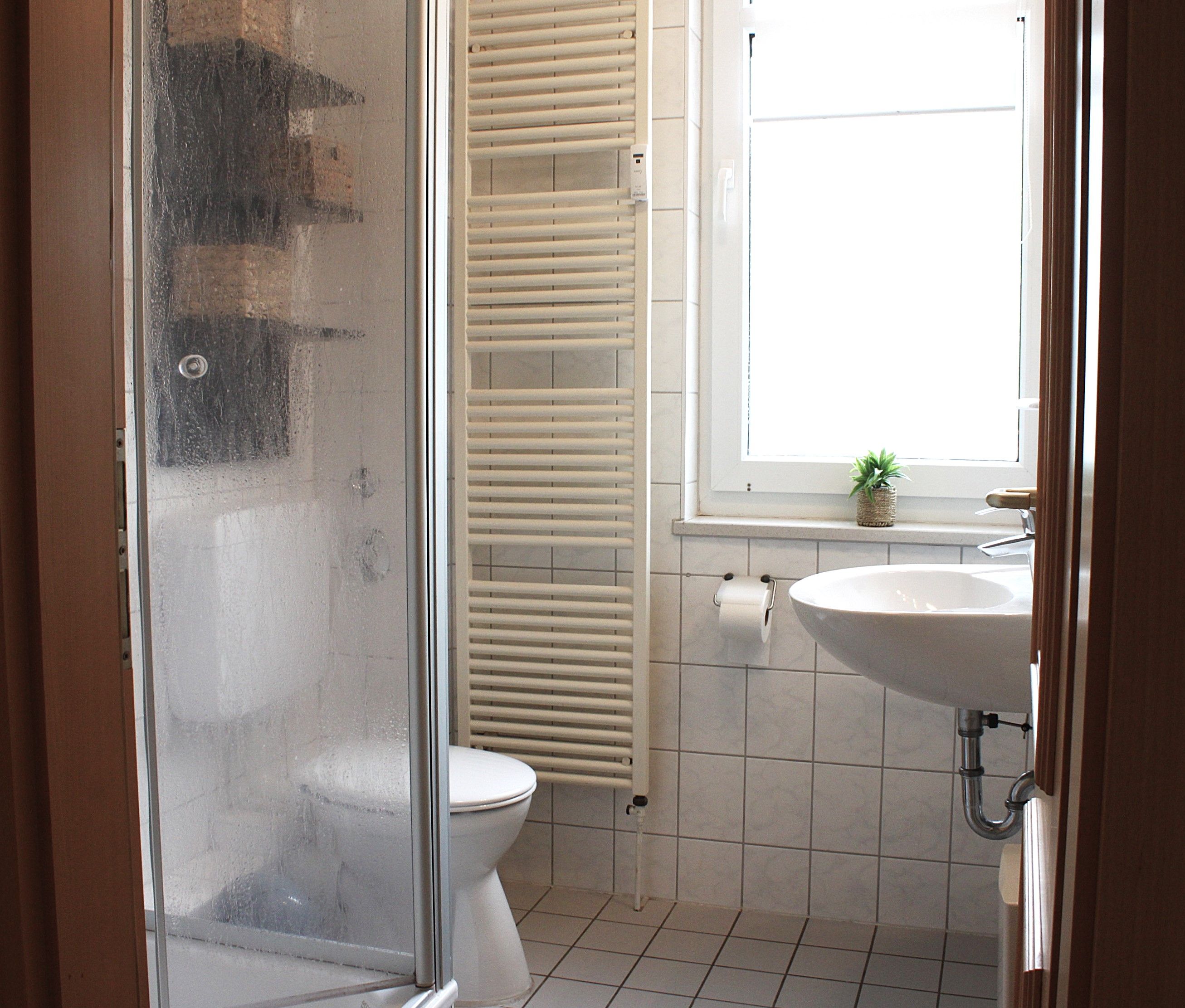 Kleines Badezimmer mit Fenster, Dusche, Waschtisch, Föhn und WC