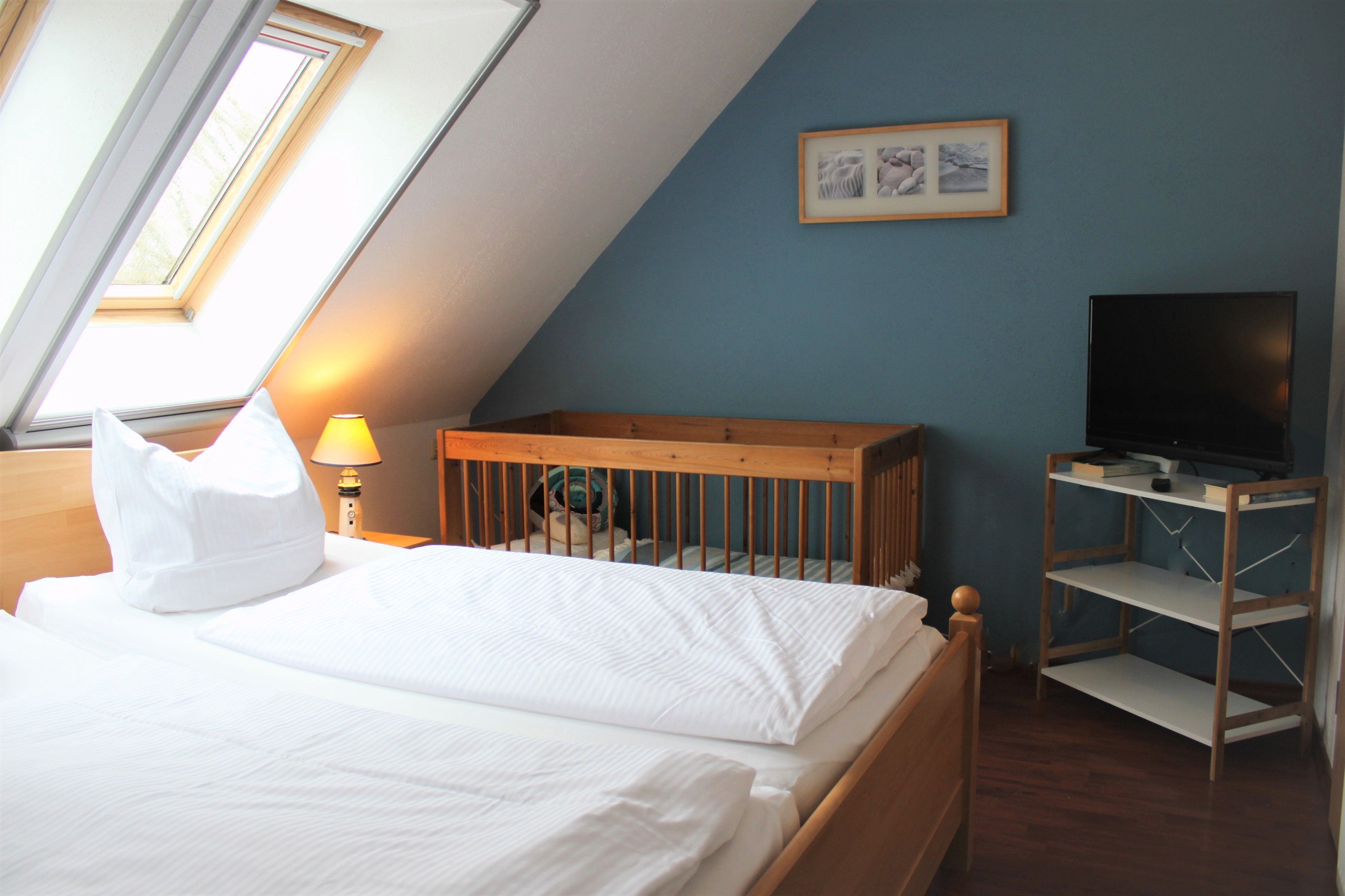 Kinderbett und Kinderhochstuhl sind vorhanden