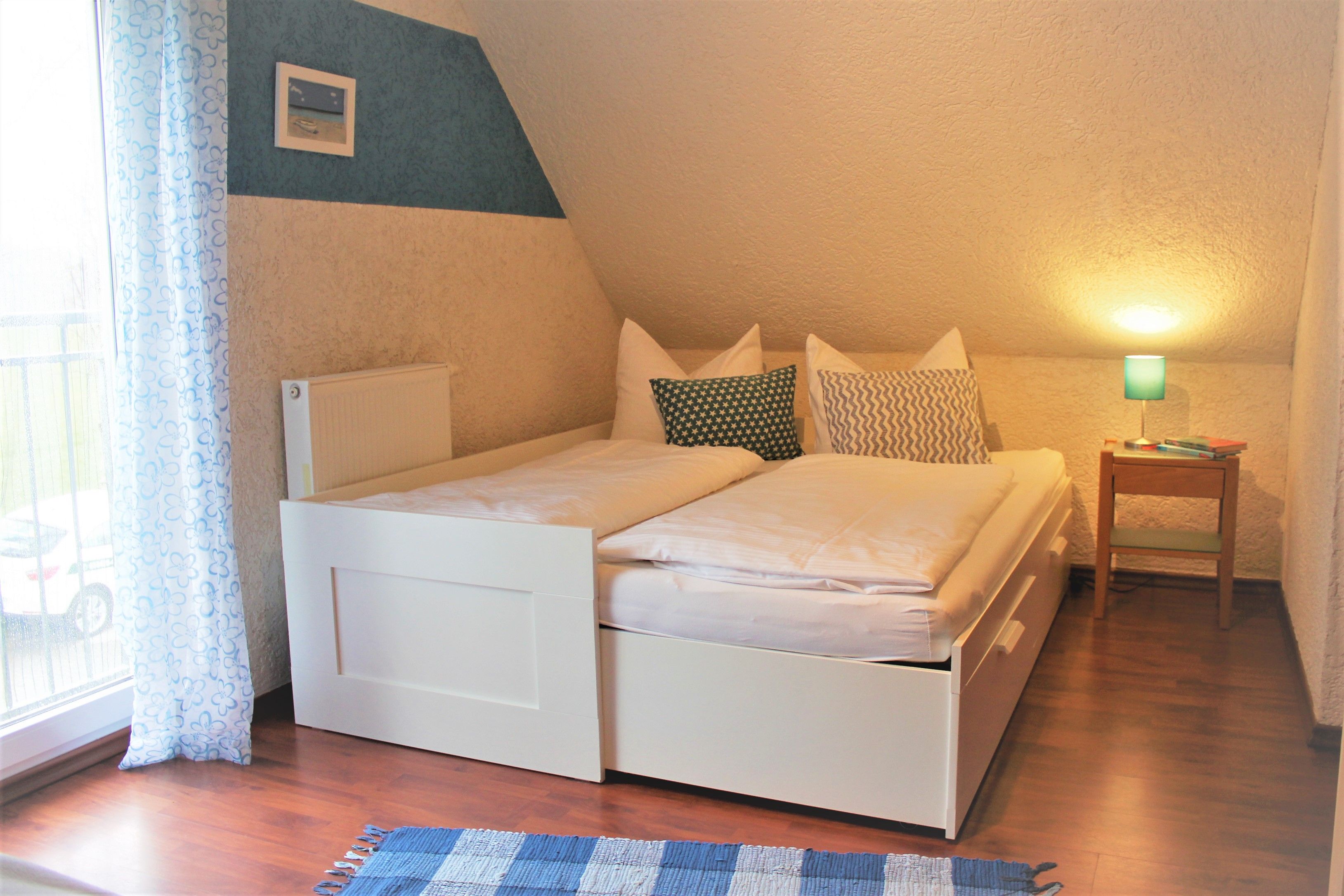 Jeweils ein Doppelbett (1x mit durchgehender Matratze) und einmal ein zusätzliches Einzelbett mit Ausziehfunktion