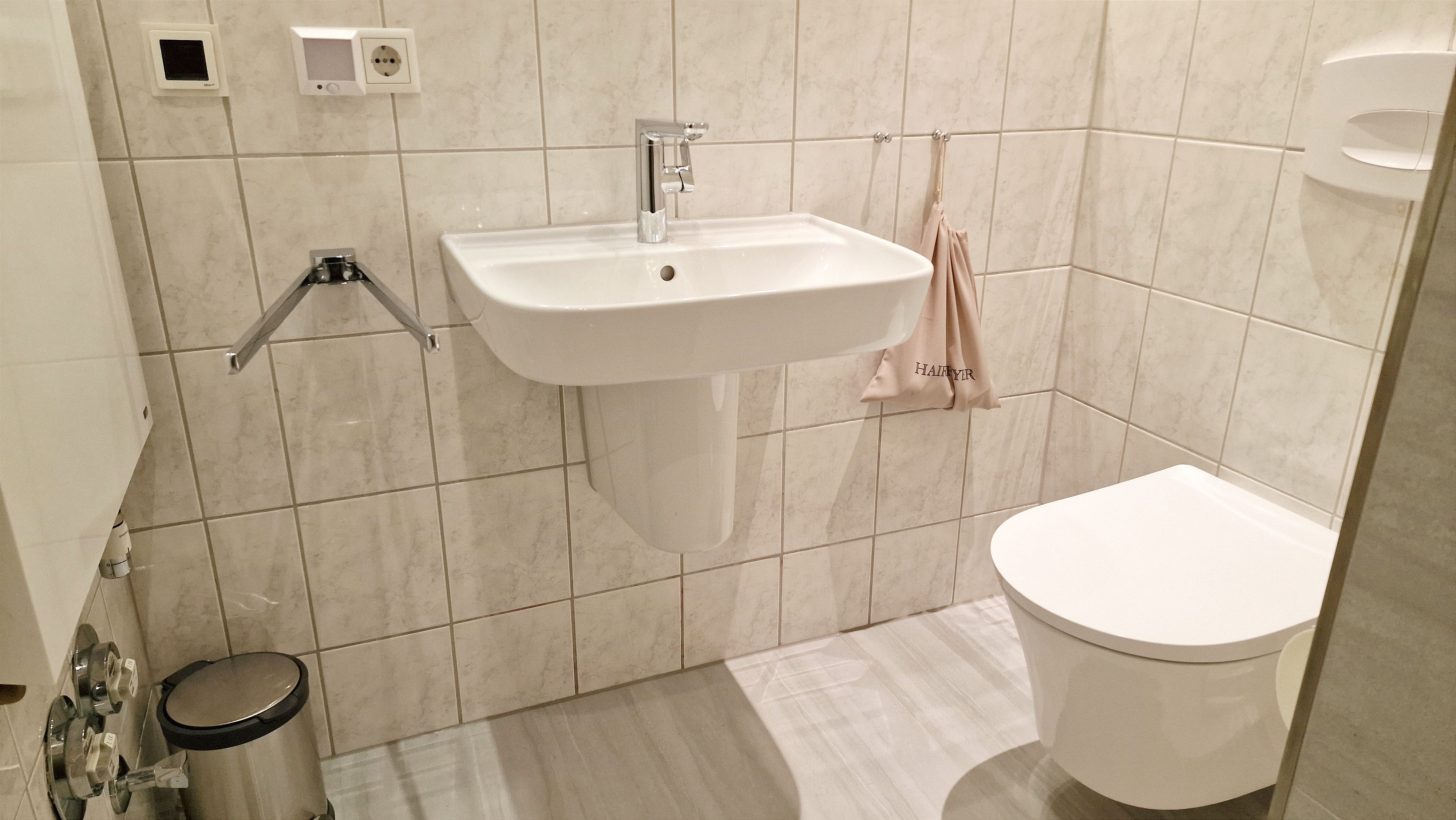 Badezimmer mit Dusche, Waschtisch und WC