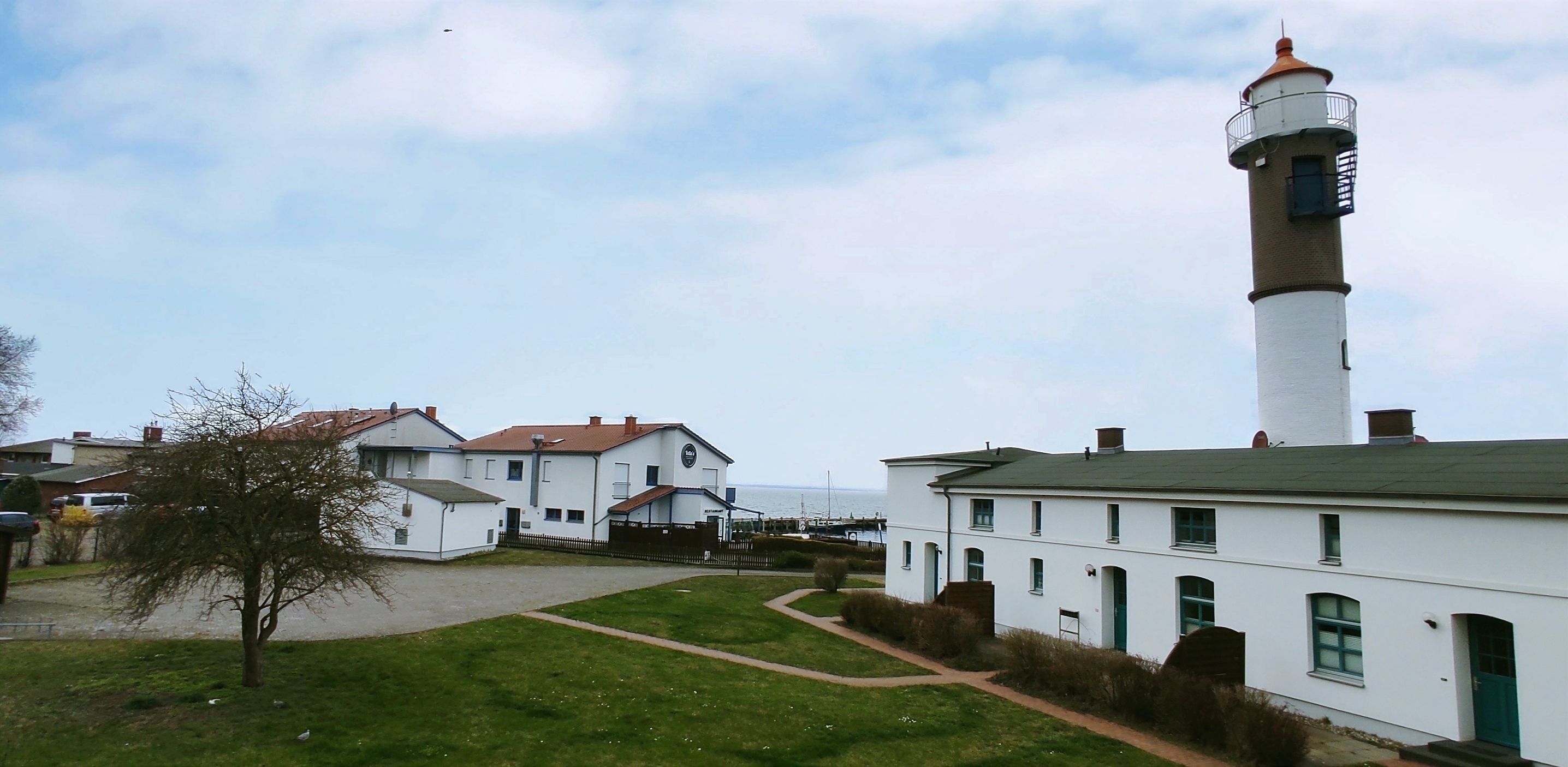 Geräumiges Wohnzimmer mit Blick auf Ostsee, Hafen und Leuchtturm.