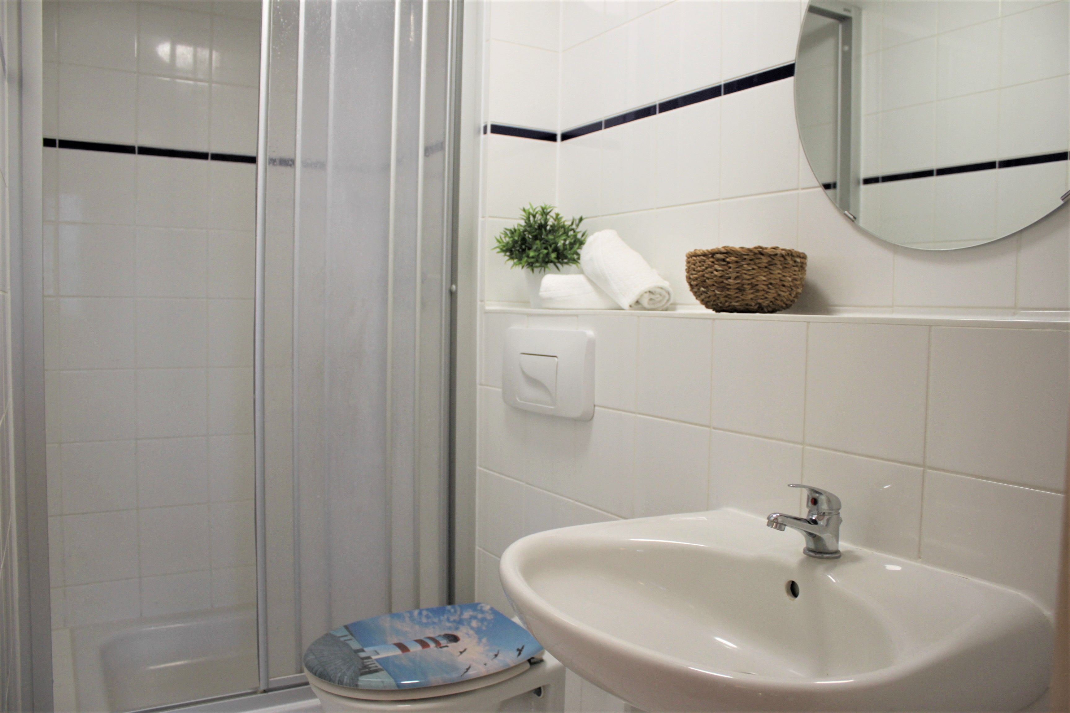 Badezimmer mit Dusche, Waschtisch und WC