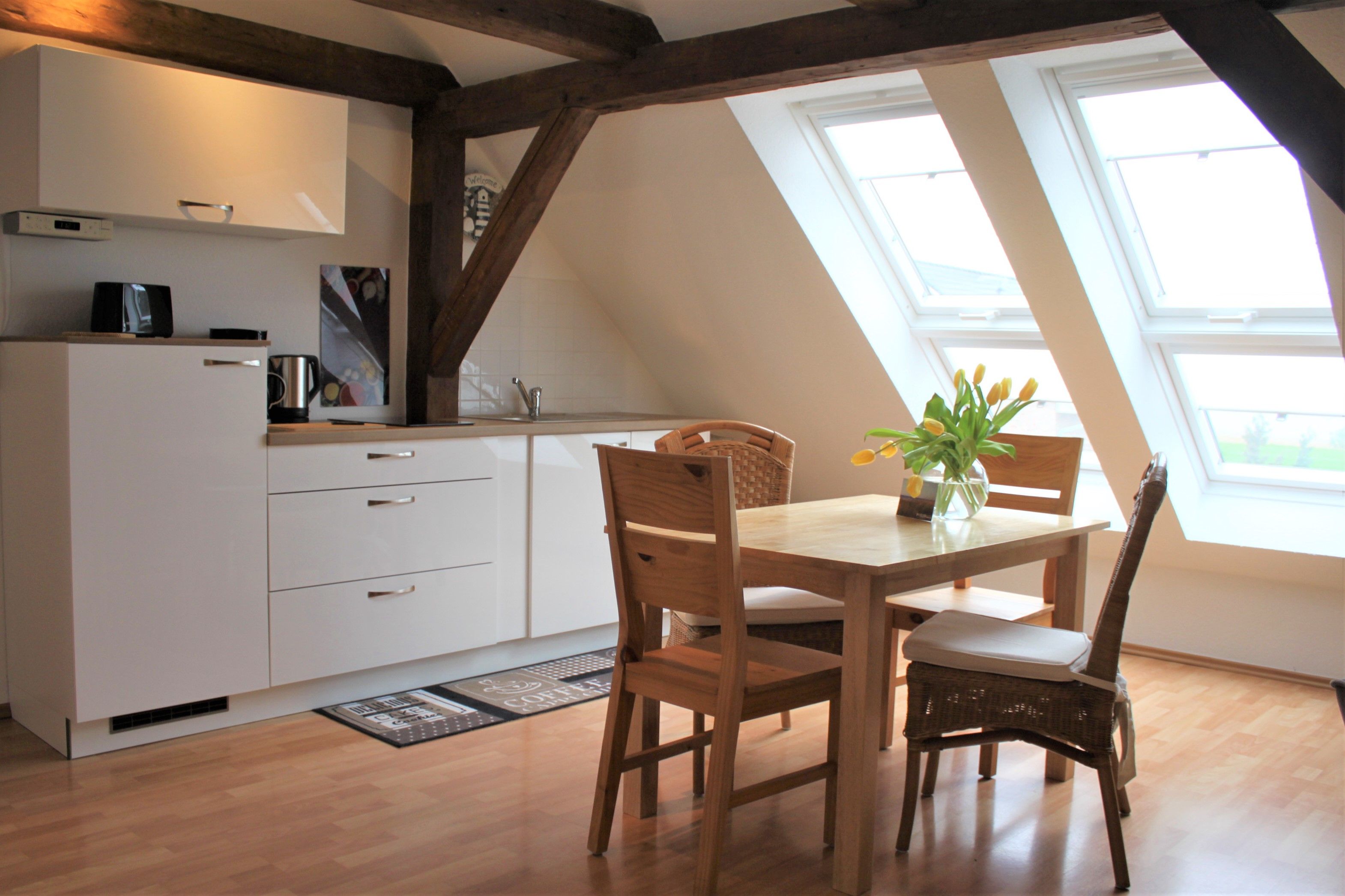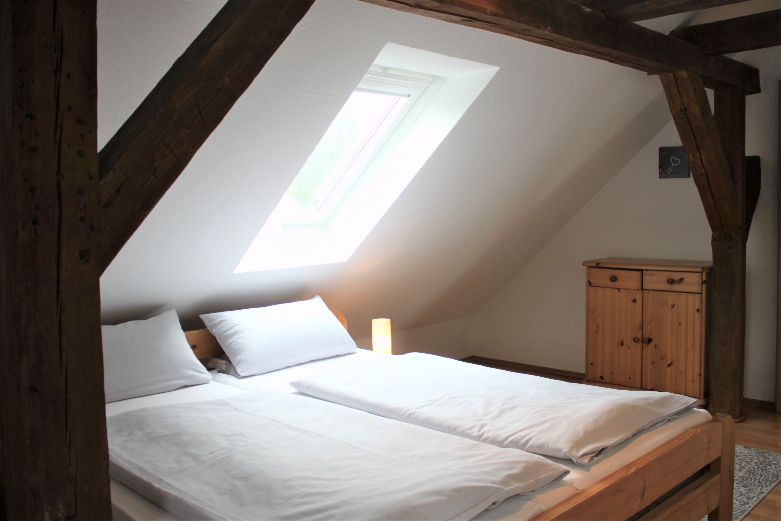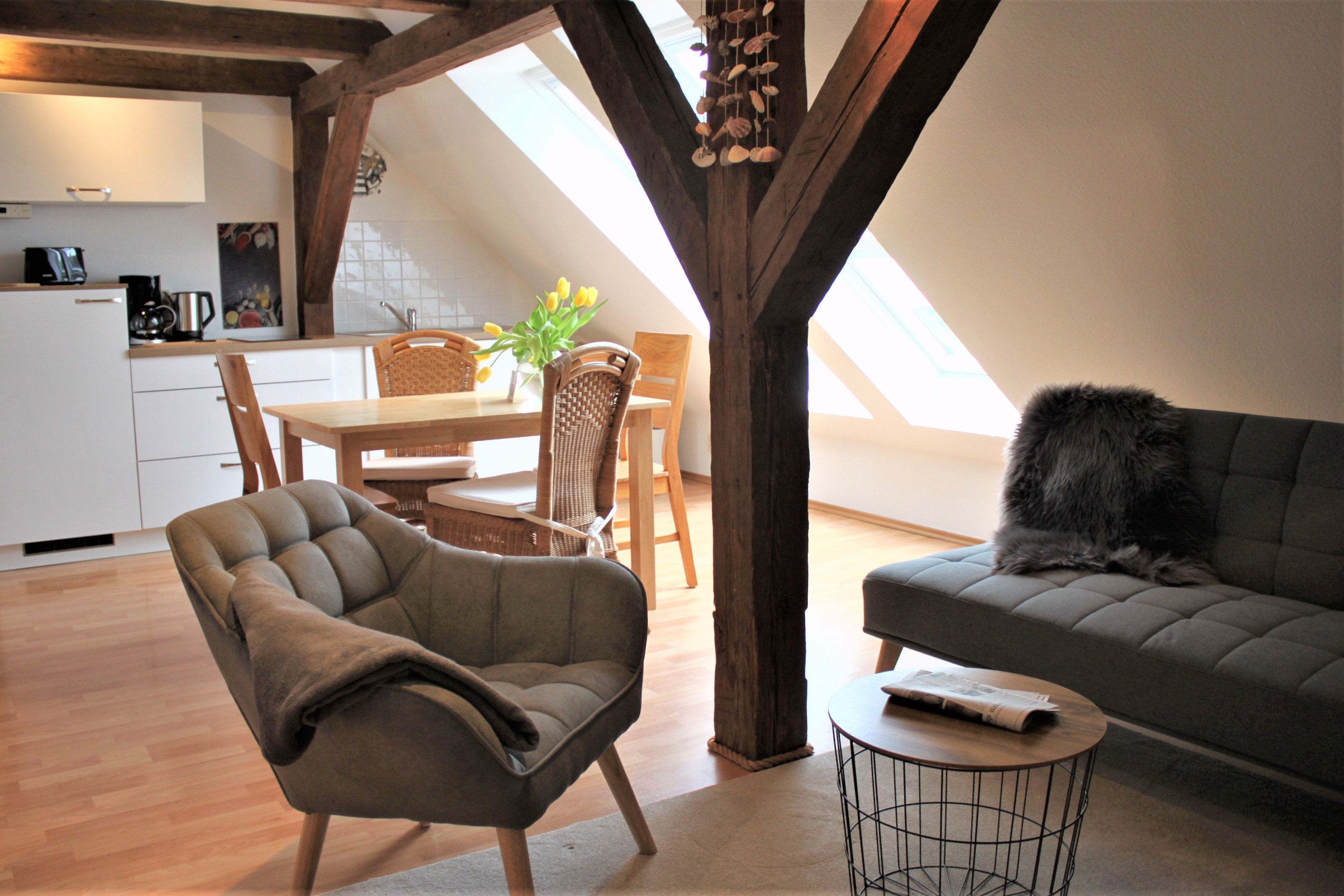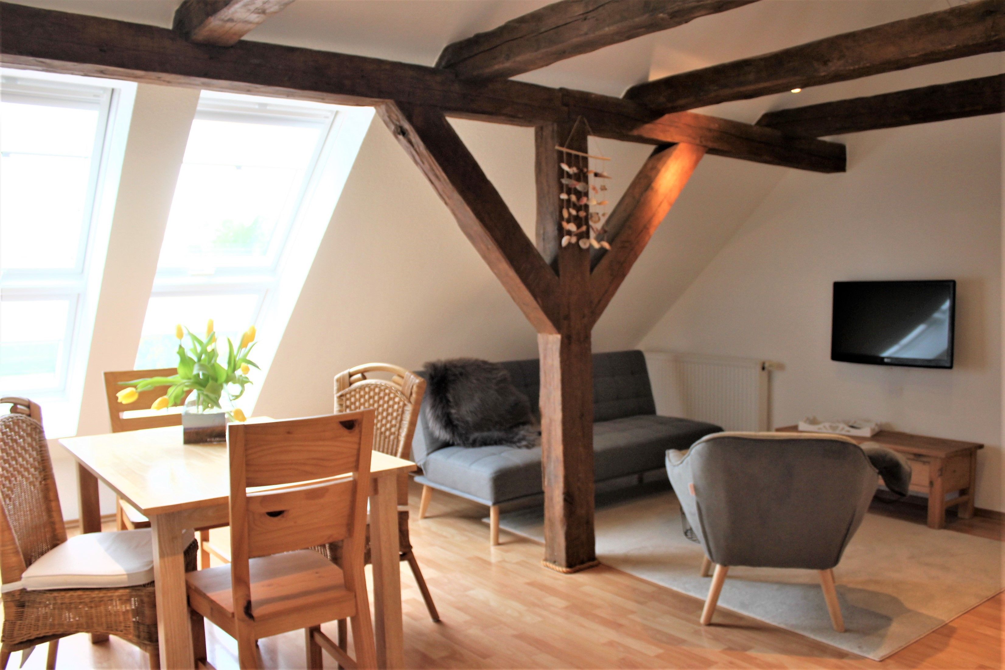 Offene Balken und große Dachflächenfenster sorgen für Wohlfühlatmosphäre
