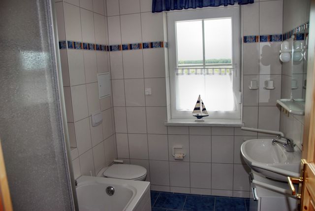 • Badezimmer mit Dusche, Badewanne, Waschtisch und WC.