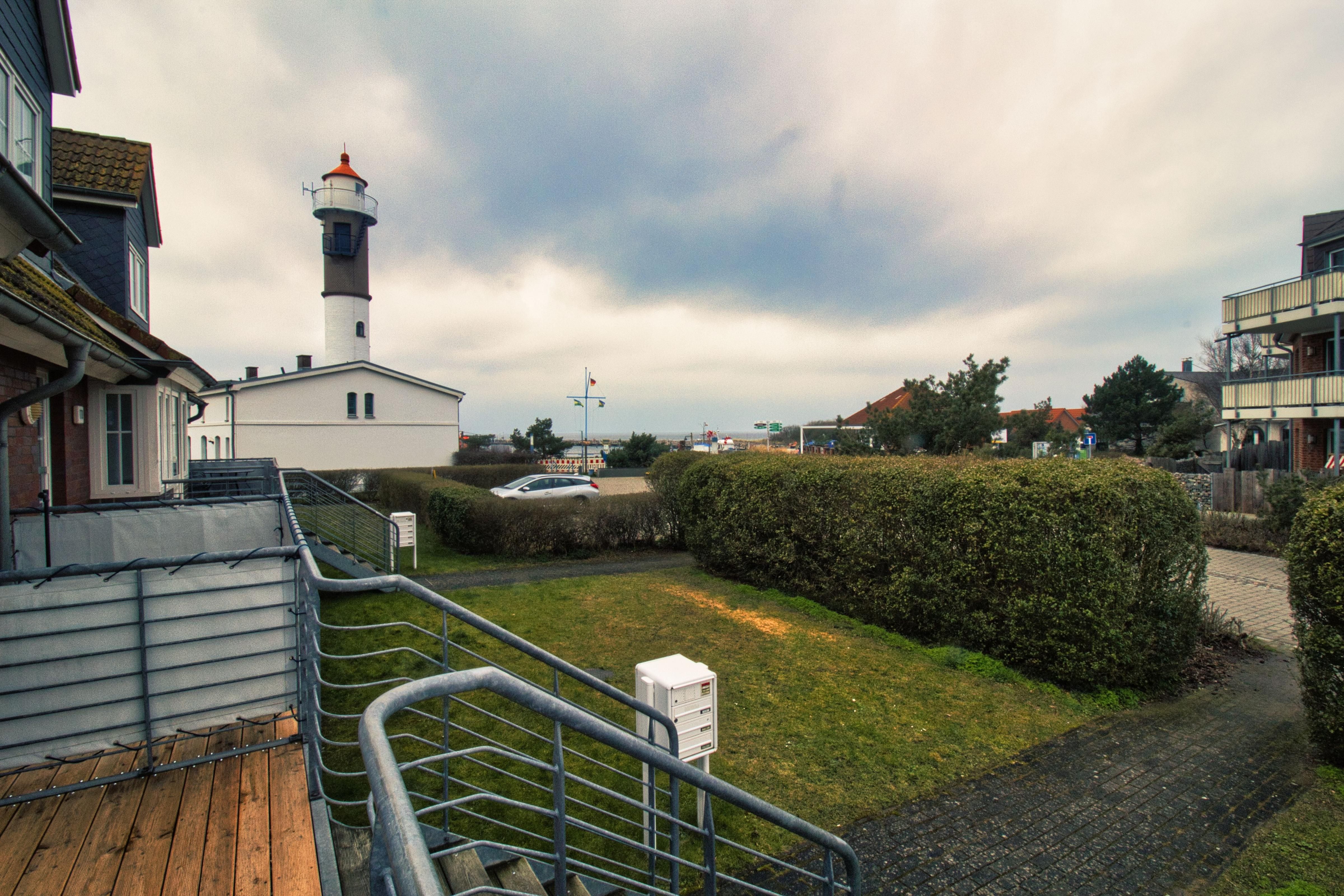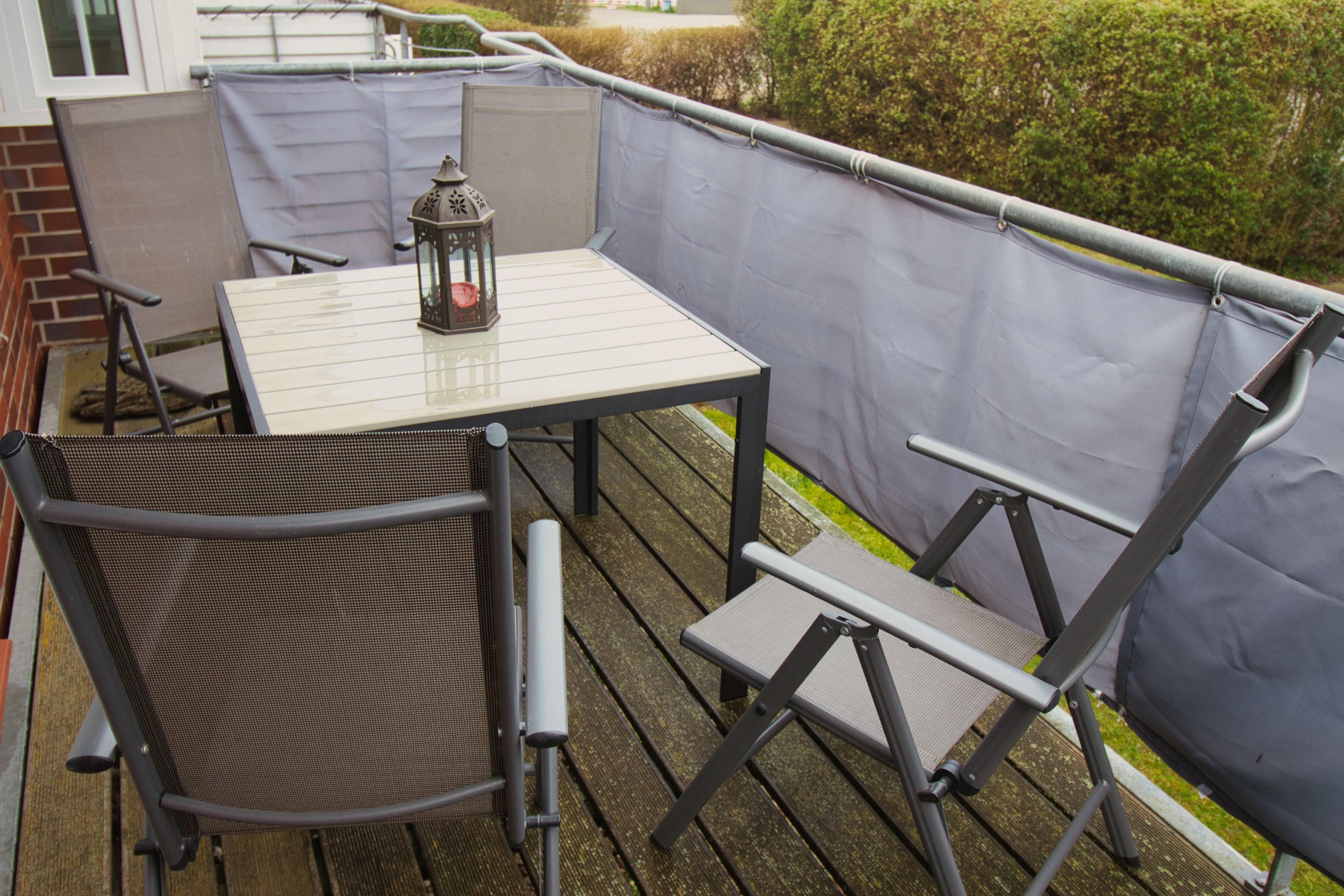 Möblierte Terrasse mit Strandkorb und zusätzlicher möblierter Balkon mit Blick auf den Leuchtturm von Timmendorf