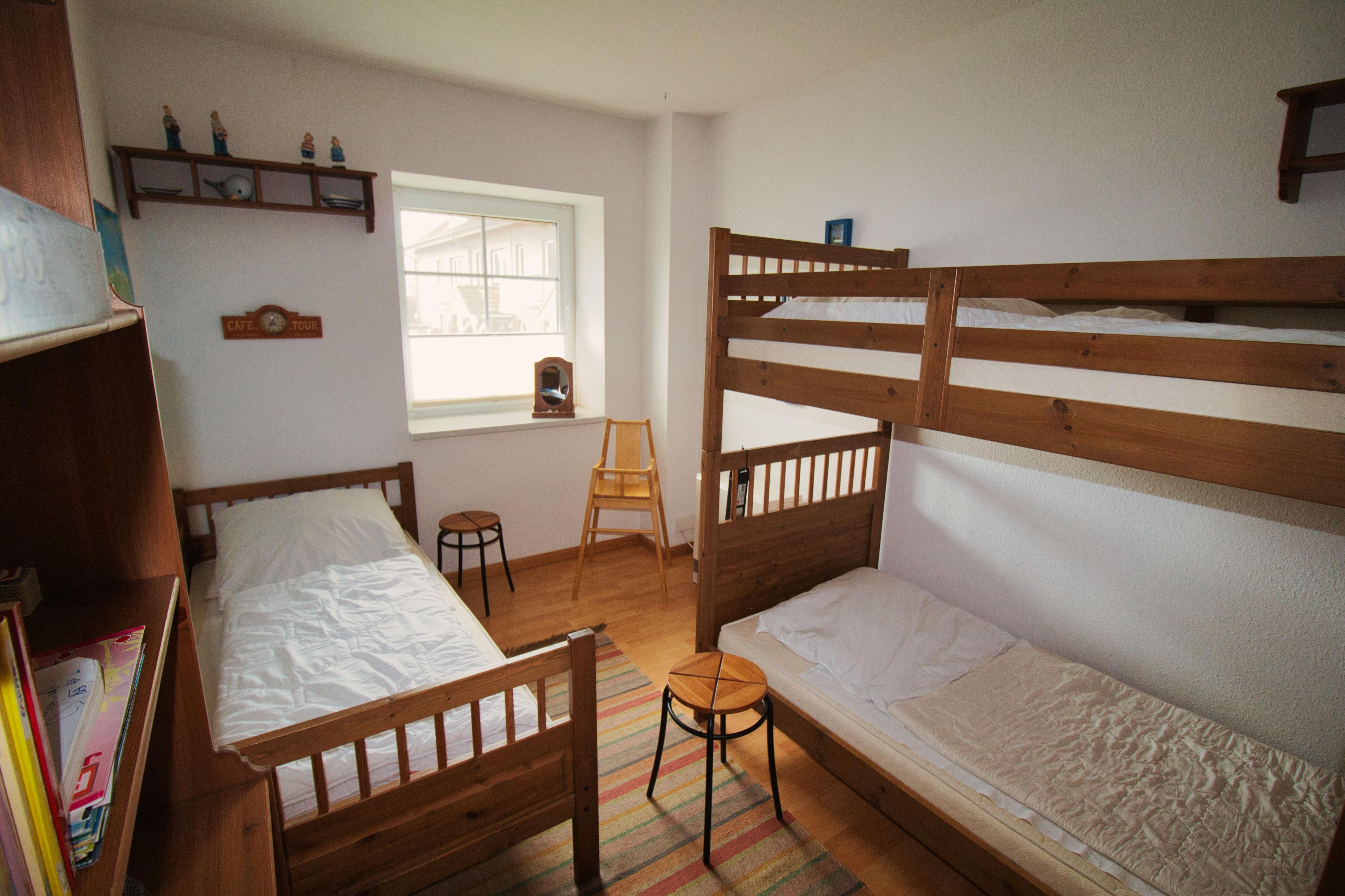 Schlafzimmer mit Doppelbett (durchgehende Matratze) oder Etagenbett und Einzelbett