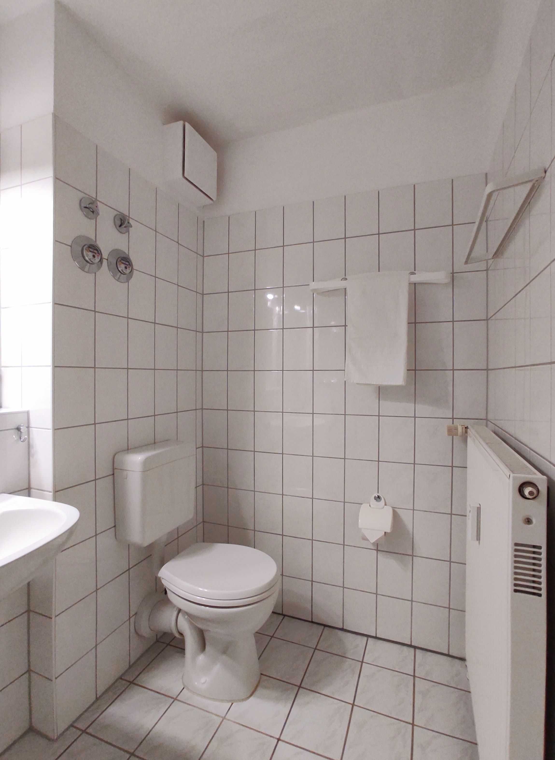Badezimmer mit Dusche, Waschtisch und WC